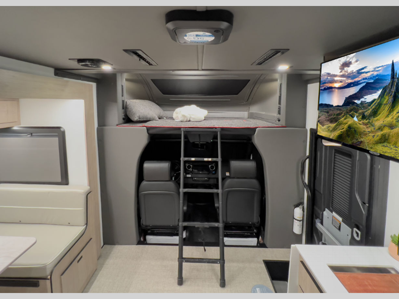 • Molded front overhead bunk with Lights, Chargers, Privacy Curtain and A/C