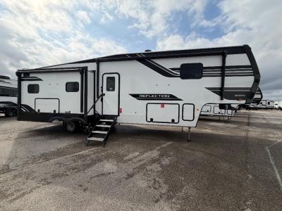 With any Reflection fifth wheel by Grand Design, you will have a solar panel for off-grid camping and a 60 amp charge controller and inverter prep, a Universal All-In-One docking station, unobstructed pass-through storage, and Goodyear Endurance tires. Each is constructed of gel coat exterior sidewalls, residential 5" truss rafters, walk-on roof decking, a fiberglass and radiant foil roof and front cap insulation plus laminated aluminum framed side walls, roof and end walls in slide rooms. Head inside to enjoy residential hardwood cabinet doors, premium Congoleum flooring, a spacious shower with a glass door, and many more comforts!