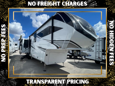 Are you looking to upgrade from a travel trailer to a fifth wheel? If so, this model will be perfect for you! Once you arrive at the campground, you can unload your gear from the pass-through storage, put out the two power awnings, then relax with a cold drink. Inside, you can kick your feet up on the theater seating, play a game at the free-standing dinette, or relax on the tri-fold sofa. The chef of your group will have a kitchen island with a Smart sink, dishwasher prep if you want the option to make cleaning up easier, plus a spacious 20 cu. ft. 12V refrigerator. There is also a built-in oven, plus a pantry and a hutch for storage galore! Having two bath sinks in the full bath is sure to be a big convenience when getting ready for bed, and the queen bed slide out in the front bedroom will provide a great night's rest. You will also find a front wardrobe, a slide top dresser, plus washer/dryer prep!