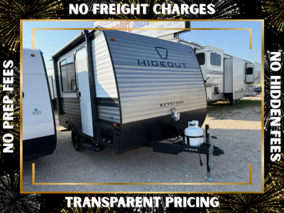 With any Hideout Mini travel trailer by Keystone, you will enjoy lightweight towing thanks to their single-axle! The AlphaPly TPO roof membrane is ultra durable, and the power awning will provide protection from the sun as you relax in your camp chairs outside. Each model includes blackout night shades, LED lighting, plus many more interior comforts. There is also a roof A/C and 20K BTU furnace to keep you comfortable, plus a tankless water heater for endless hot showers!