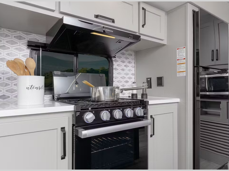 - 3-burner gas range and 21" Furrion® stove w/ low pro hood vent