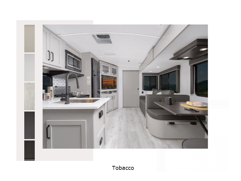 Sleeps 5 Slides 2 Length 31 ft 3 in Ext Height 11 ft 4 in Int Height 6 ft 6 in Interior Color Stone, Tobacco Exterior Color Royal Gold, Obsidian Hitch Weight 1005 lbs Dry Weight 7475 lbs Cargo Capacity 2025 lbs Fresh Water Capacity 54 gals Grey Water Capacity 76 gals Black Water Capacity 38 gals Tire Size ST225/75R15E Furnace BTU 35000 btu Available Beds King Refrigerator Type 12V GE Refrigerator Size 10 cu ft Cooktop Burners 3 Shower Size 34" Number of Awnings 1 Axle Weight 5100 lbs LP Tank Capacity 30 lbs Water Heater Type On Demand AC BTU 15000 btu TV Info LR HDTV Awning Info 19' Lighted Power with Adjustable Arms Axle Count 2 Number of LP Tanks 2 Shower Type Radius Similar Floorplans
