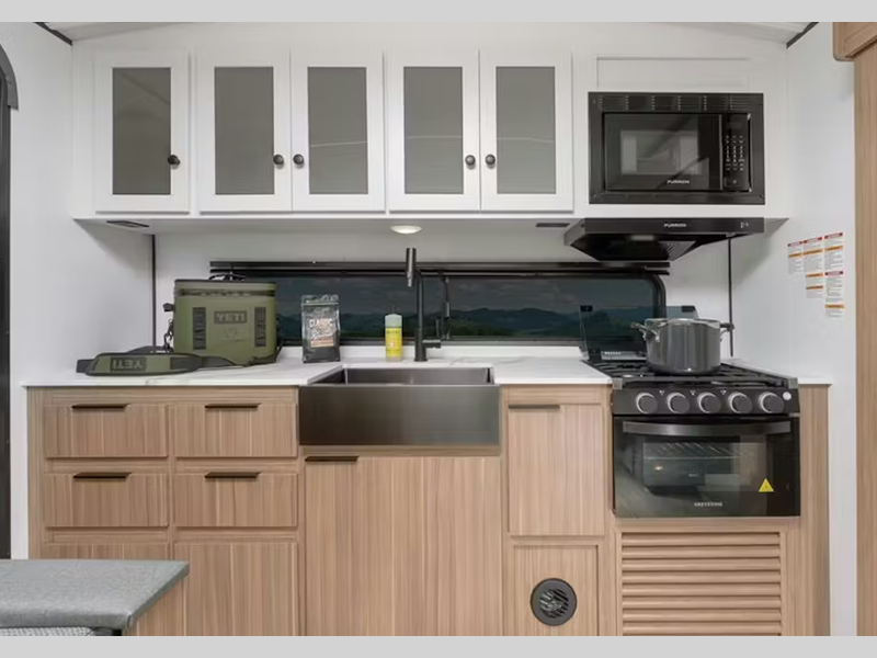 Sleeps 5 Slides 1 Length 28 ft 8 in Ext Height 11 ft 3 in Interior Color Cedar Frost Hitch Weight 650 lbs Dry Weight 6000 lbs Cargo Capacity 1600 lbs Fresh Water Capacity 54 gals Grey Water Capacity 76 gals Black Water Capacity 38 gals Tire Size ST205/75R14D Furnace BTU 30000 btu Available Beds Queen Refrigerator Type Double Door 12V Refrigerator Size 10 cu ft Cooktop Burners 3 Number of Awnings 1 LP Tank Capacity 20 lbs Water Heater Type Girard Tankless AC BTU 13500 btu Awning Info 15' Axle Count 2 Number of LP Tanks 2 Shower Type Standard Similar Floorplans
