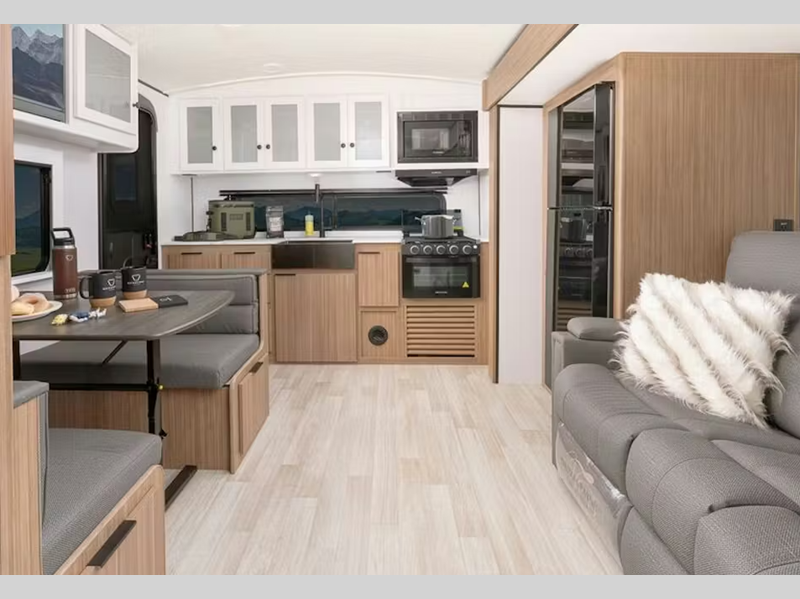 Sleeps 4 Slides 1 Length 30 ft 8 in Ext Height 11 ft 3 in Interior Color Cedar Frost Hitch Weight 700 lbs Dry Weight 6433 lbs Cargo Capacity 2067 lbs Fresh Water Capacity 54 gals Grey Water Capacity 38 gals Black Water Capacity 38 gals Tire Size ST205/75R14D Furnace BTU 30000 btu Available Beds Queen Refrigerator Type Double Door 12V Refrigerator Size 10 cu ft Cooktop Burners 3 Number of Awnings 1 LP Tank Capacity 20 lbs Water Heater Type Girard Tankless AC BTU 13500 btu Awning Info 19' Axle Count 2 Number of LP Tanks 2 Shower Type Standard Similar Floorplans